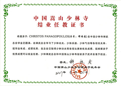 After a long training cycle in 2007 he officially took the title of "Shaolin Cosmic Apostle" by the teacher Shì Héng Jūn of the Fawang temple school along with all legally certified documents attesting to his responsibility as a teacher of traditional Shaolin Kung Fu. The same year he founded in the city of Corinth the Traditional Shaolin and Tai Chi School "Source of Young Forest" maintained as today.
