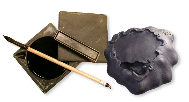 Κινεζική καλλιγραφία, η τέχνη της γραφής των ιδεογραμμάτων, μελετάται σε τέσσερα μέρη: Πινέλο, μελανοδοχείο, μελάνι και το χαρακτηριστικό ρυζόχαρτο "Σουάν Τζι" 宣纸 (xuānzhǐ) χαρτί. Αυτοί είναι επίσης γνωστοί ως οι "τέσσερις θησαυροί μελέτης". Αυτά τα εργαλεία-γραφής καθώς και οι συμπληρωματικοί πολύτιμοι λίθοι, όπως το στήριγμα του πινέλου, τα βάρη για το κράτημα του χαρτιού και τις χειροποίητες σφραγίδες, ήταν το σήμα κατατεθέν των μορφωμένων και όσοι τα κατείχαν (υλικά και τεχνικά) θεωρούνταν οι λόγιοι της εποχής.